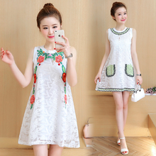 2017春季新品无袖蕾丝连衣裙条纹沙滩长裙刺绣中长款收腰背心裙