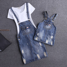 2017夏季新品亲子装韩版码休闲百搭大水洗破洞牛仔背带连衣裙女潮