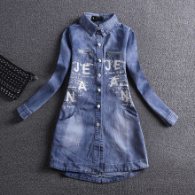 2017春夏新品女装字母图案长袖牛仔衬衣中长款修身磨破衬衫外套潮
