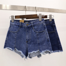 AMG春夏显瘦平行竖条A字不规则毛边阔腿微喇包臀牛仔高腰短裤女