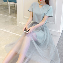 2017夏季新款韩版网纱假两件a字中长款连衣裙女 短袖显瘦裙子学生