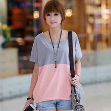 2016新款大码女装拼接显瘦胖MM夏装韩版百搭蝙蝠衫宽松T恤女短袖