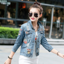 春秋季新款七分袖女装上衣徽章贴布破洞学生长袖短款牛仔外套女潮