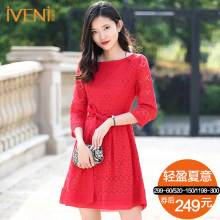 IVENI/依维妮2017夏气质淑女高腰蓬蓬裙短袖A字蕾丝连衣裙公主879