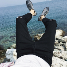 夏季九分裤潮男小脚裤日系修身型破洞黑色牛仔裤青年学生乞丐裤子