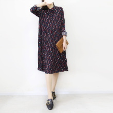 复古几何图案系带连衣裙女宽松中长款长袖下摆拼接百褶裙2017春款