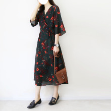 复古碎花连衣裙长裙女装V领套头七分袖碎花裙大摆裙2017春夏新款
