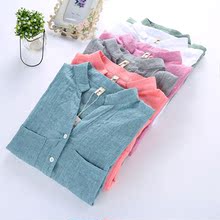 春夏新款 韩范清新条纹显瘦棉麻立领衬衫 打底修身百搭衬衣女学生