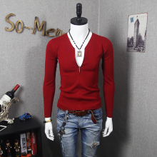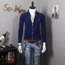 2017秋冬新款男装 韩版时尚塑身型男纯色 紧身拉链羊毛开衫针织衫