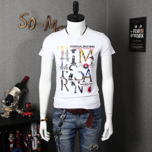 2017春夏新款 气质潮男奢华英文彩字时尚休闲修身圆领男装短袖t恤
