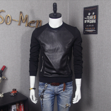 2017春秋新款 欧美商务休闲个性拼皮设计 宽松套头圆领卫衣潮男装