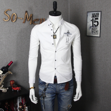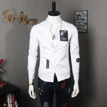 2017秋季新品 时尚奢华气质贴标印花 紧身青年长袖衬衫衬衣潮流男