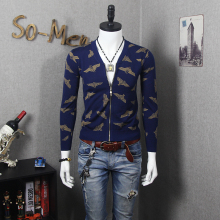 2017秋冬新款男装 欧美时尚空军花纹提花 修身拉链羊毛开衫针织衫
