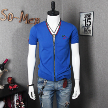 2017秋夏过渡新品 欧美气质刺绣 紧身针织拉链开衫V领短袖T恤男装