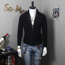 2017秋冬新款男装 奢华真皮翅膀贴标 修身拉链兔毛针织衫羊毛开衫