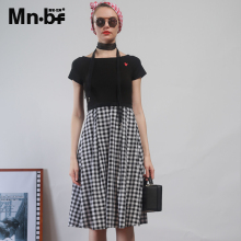 曼诺比菲mnbf夏季新款修身显瘦收腰一字肩中长款格子连衣裙