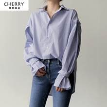 韩版寸衬衣女长袖百搭清新甜美2017学生上衣条纹灯笼袖衬衫泡泡袖