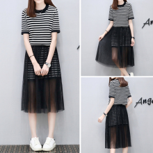 欧洲站2107夏装新款韩版时尚显瘦针织中长裙配松紧腰纱裙两件套装