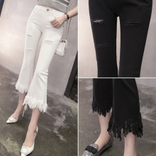 2017春夏款新款韩版学生微喇叭裤女毛边破洞牛仔休闲裤九分打底裤