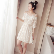夏季新款韩版立体花朵雪纺吊带a字裙女松紧收腰一字领露肩连衣裙