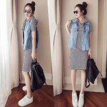 套装裙女2017春季新款韩版中长款连帽休闲连衣裙+牛仔马甲两件套