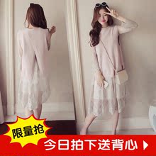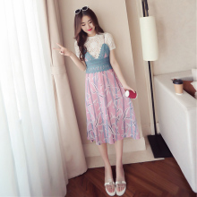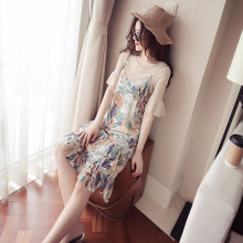 套装裙女春装新款韩版蕾丝拼接吊带印花雪纺连衣裙+蕾丝T恤两件套