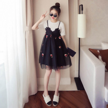 套装裙女夏季新款韩版爱心高腰蓬蓬裙吊带网纱连衣裙+短袖T恤两件