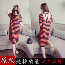 2016夏装新款韩版露背宽松条纹针织连衣裙圆领短袖中长款开叉裙女
