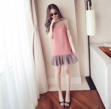 春夏新款韩版假两件亮丝拼接百褶雪纺连衣裙女小清新短袖鱼尾裙