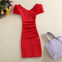 女装礼服短裙夏季黑色v领2017性感雪纺修身显瘦肩花包臀一步裙子