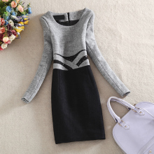 新款2017秋时尚打底修身撞色毛呢连衣裙冬季韩版中长款女士呢子裙
