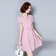 韩版a字连衣裙女大码修身短袖裙蝴蝶结夏款小香风收腰小礼服粉色