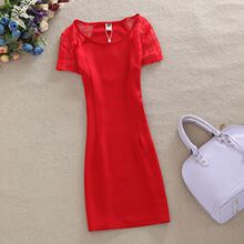 2017夏季新款镂空短袖蕾丝连衣裙职业修身显瘦包臀一步裙子红色