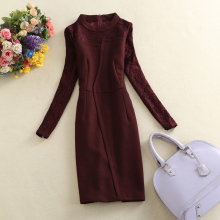 秋冬大码女装胖mm2016韩版修身显瘦蕾丝拼接毛呢一步包臀连衣裙子