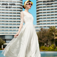 婧涵2017夏季新款网纱刺绣大摆短袖淑女连衣裙蕾丝白色长裙仙气质