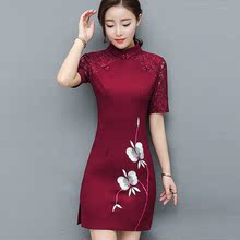 刺绣连衣裙2017新款春秋款大码女装蕾丝修身显瘦短袖打底包臀短裙