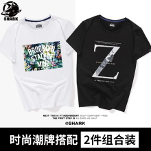 鲨鱼头夏天男士短袖白色彩条t恤男个性创意情侣装夏季半截袖潮牌