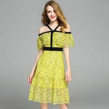 欧美雪纺连衣裙女短袖v领中长款大码宽松露肩一字领蕾丝黄色a字裙
