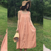 SUPERSCAPE素泊中长款纯色背带裙单排扣收腰系带无袖连衣裙女夏