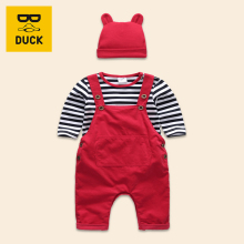 春秋新款宝宝纯棉条纹爬服 婴儿连身衣外出服哈衣背带裤三件套装