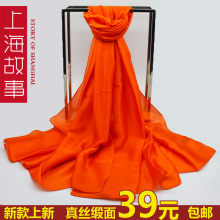 上海故事春夏真丝围巾长款女纯色橘色缎面披肩两用桑蚕丝单色丝巾