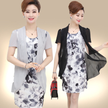 中老年连衣裙夏季妈妈装夏装大码女装中长裙子雪纺印花短袖两件套