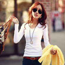 韩版V领纯棉长袖女士t恤修身显瘦体恤秋季纯色打底衫上衣加绒加厚