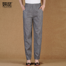 中年人中老年女裤妈妈裤子春秋夏装松紧腰高腰九分裤亚麻棉麻休闲