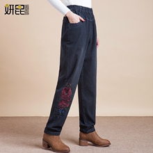 中老年女裤妈妈裤子秋冬装老年人松紧腰绣花高腰牛仔长裤休闲裤装