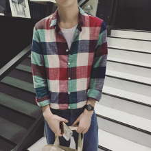 男士春夏韩版潮修身格子衬衫长袖棉麻薄款小清新休闲衬衣学生寸衫