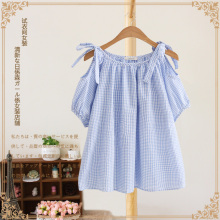 日系小清新女装露肩蝴蝶结棉麻衫宽松百搭格纹衫圆领短袖T恤上衣