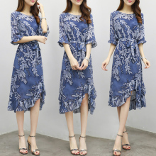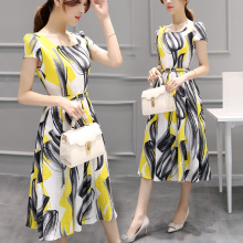 2017夏装新款女装韩版修身中长款短袖印花复古女显瘦雪纺连衣裙