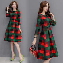 2017新款女装秋装欧洲站修身高腰中长款连衣裙女七分袖格子收腰裙