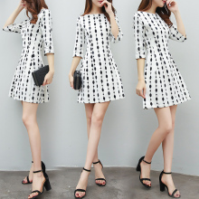 2017新款女装春装修身中长款连衣裙女名媛显瘦圆点七分袖打底裙